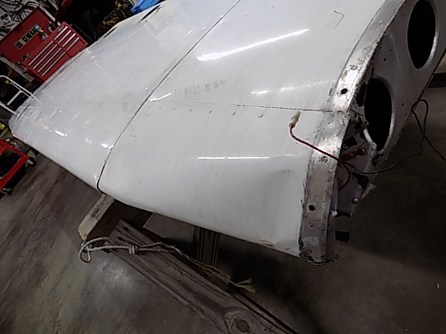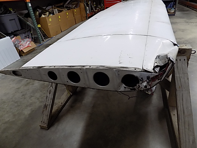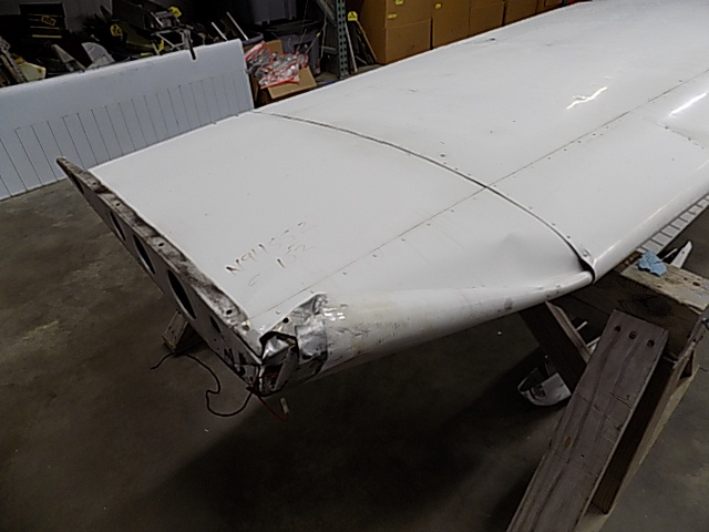 Details: Front and backside outboard leading edge skins and end rib damaged. Wing root end rib and aft spar bent. Skin cracked near fuel tank wire attach (See Photos).
