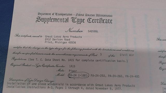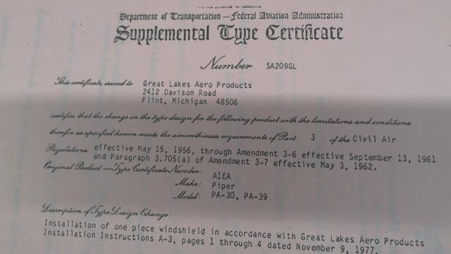 MFR/Title: Piper - ONE PIECE WINDSHIELD (STC# SA208GL)